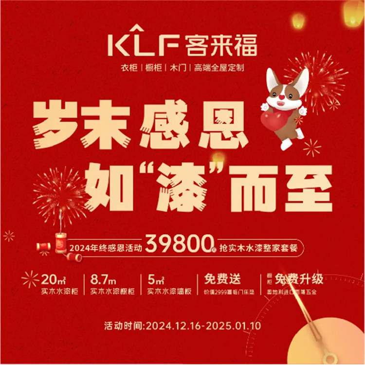實(shí)木水漆,整家煥新。即日起至2025年1月10日,客來福家居聯(lián)動(dòng)全國百城千家門店,共同開啟“2024年終感恩”全民狂歡活動(dòng),為家居品質(zhì)升級,環(huán)保升級,舒適升級。