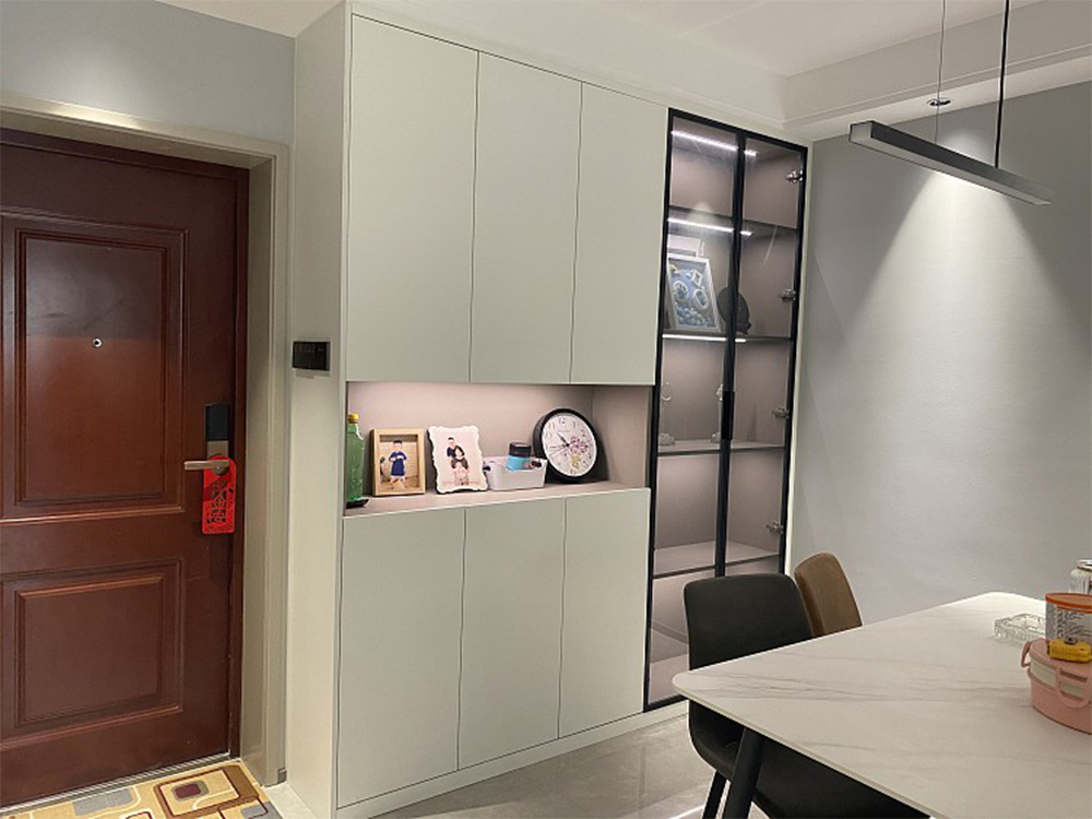 進(jìn)門是餐廳,所以設(shè)計(jì)師將入戶玄關(guān)柜和酒柜合二為一,多功能的柜子采用一柜到頂?shù)臉邮?,?shí)木乳白玄關(guān)柜可以在落地柜存放鞋子和雜物,在上層的柜子里還可以收納餐具,作為餐邊柜。中間鏤空的柜面可以擺放相冊等裝飾品,或者擺放日常用品。