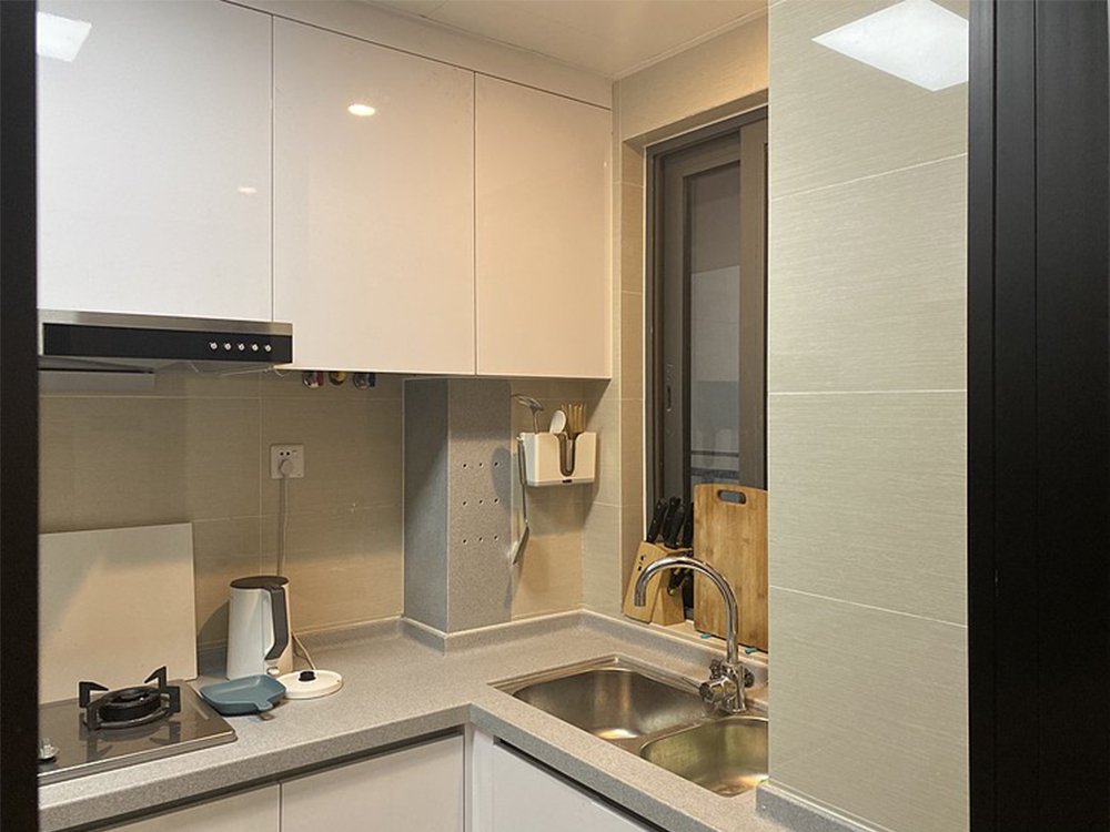 C字型廚房占整個(gè)房屋面積很小,但是五臟俱全。上下柜體都可以收納,大理石臺面方便清理。