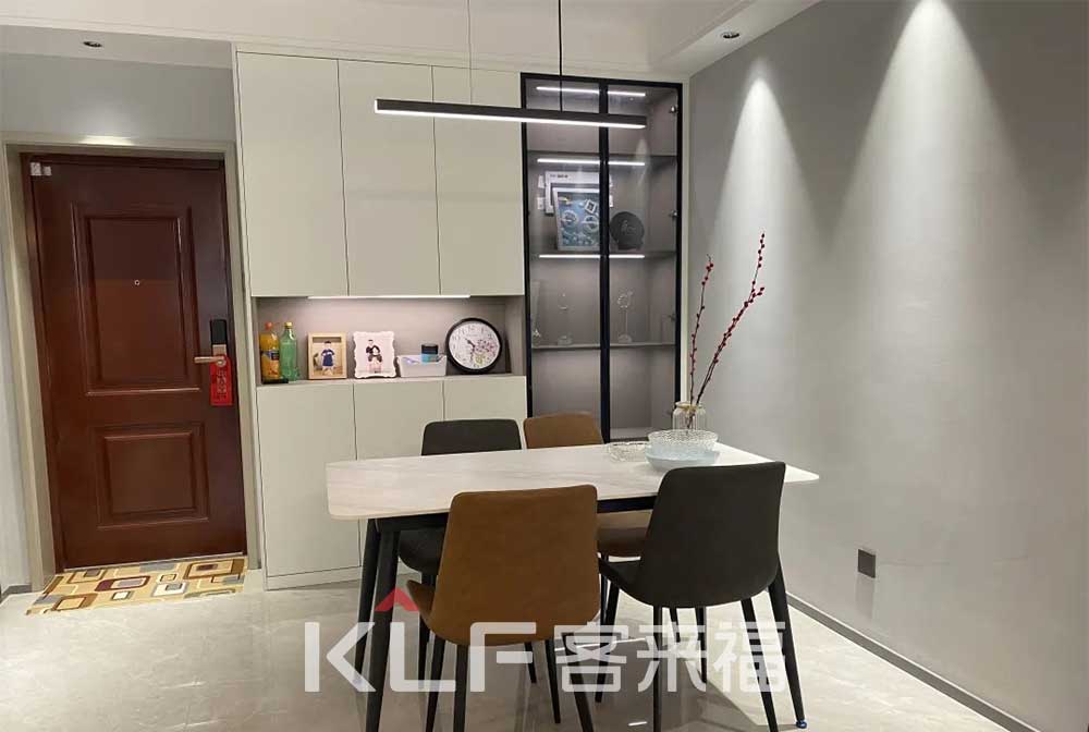 入戶即是餐廳,餐廳旁就是廚房,拉近家居生活動線。透明門板餐邊柜高端大氣,不僅可以擺放裝飾品,也可以存放酒水飲料。