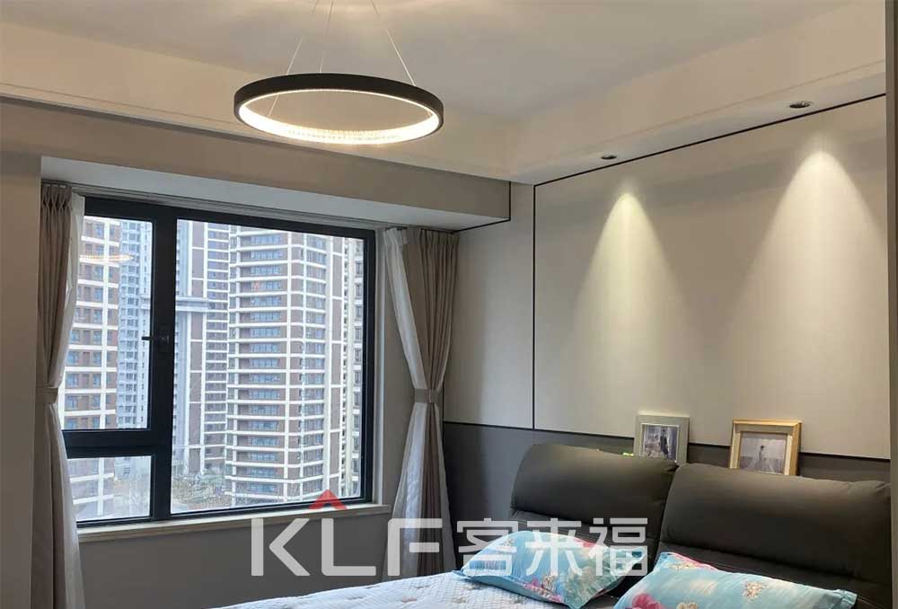 環(huán)形頂燈創(chuàng)意十足,光圈范圍廣,造型吸睛。帶滑輪的床頭柜方便移動,黑色的菱形線條,簡約卻不簡單。一家三口幸福的合照陪伴著入睡。