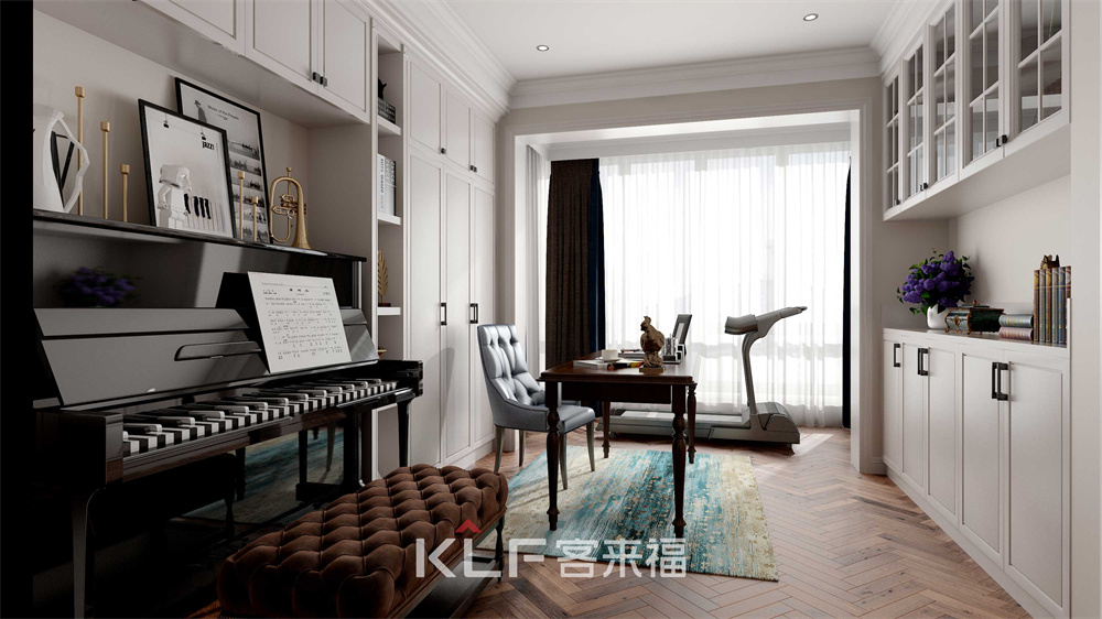 精簡白色典雅空間內(nèi),優(yōu)雅的黑色鋼琴強(qiáng)勢吸睛,將高貴氣質(zhì)展現(xiàn)地淋漓盡致。合理的空間規(guī)劃,讓小小的書房幻化成凡爾賽現(xiàn)場。人性化多層窗簾設(shè)計(jì),合理利用陽光。白色加深色系搭配沖擊,凸顯書房主人別樣雅致,可謂“腹有詩書氣自華”。