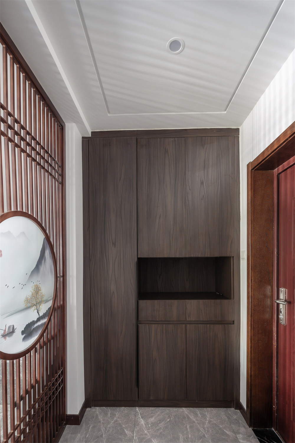 進(jìn)門處便是整面到頂?shù)囊鹿?,可以省去柜頂打掃的煩惱。玄關(guān)柜在右側(cè)柜體中間做了鏤空設(shè)計(jì),便于日常放置鑰匙、快遞等小物件。