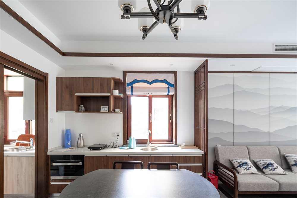 餐廳處沒有多余的修飾,前方定制了整體的餐邊柜,安裝了洗手池、轉(zhuǎn)角柜等設(shè)計(jì),方便在吃飯后清洗手。窗戶上面采用拉伸式窗簾的設(shè)計(jì),在吃飯時(shí)便可看見窗外的景色。轉(zhuǎn)角柜的設(shè)計(jì)便于放置一些熱水壺、碗筷、抽紙等日常物品,在吃完飯便可拿取抽紙來擦拭。