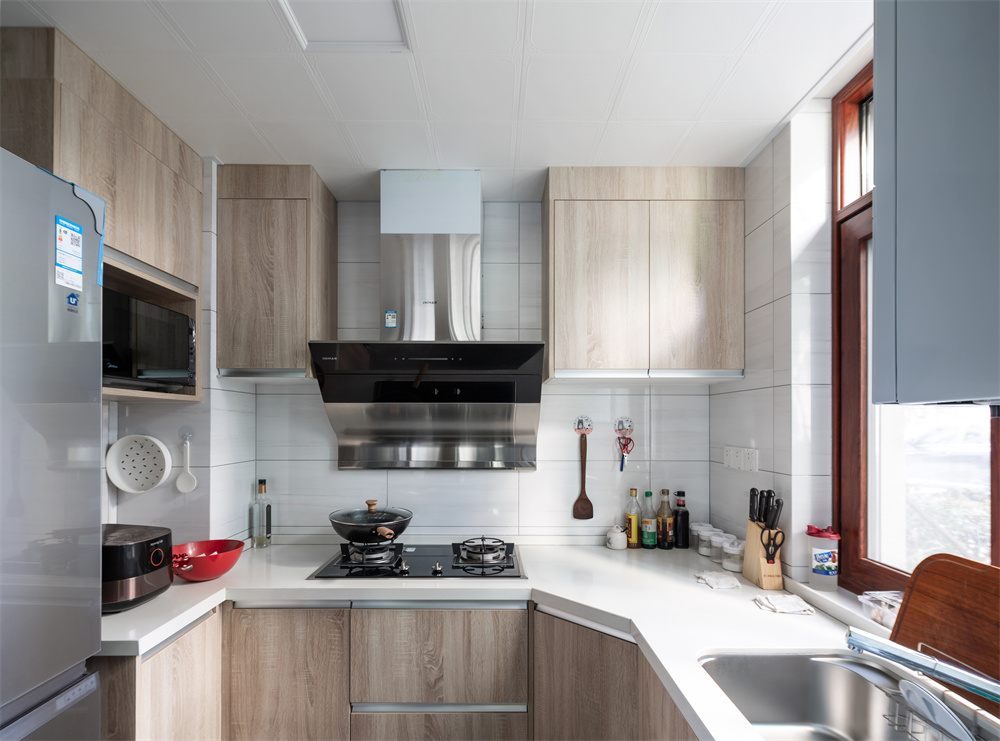 廚房:整體采用了U型的空間設(shè)計(jì)頂部木色柜體的設(shè)計(jì),充分利用油煙機(jī)兩旁的空間,便于放置一些家用電器、餐盤、榨汁機(jī)等物品。