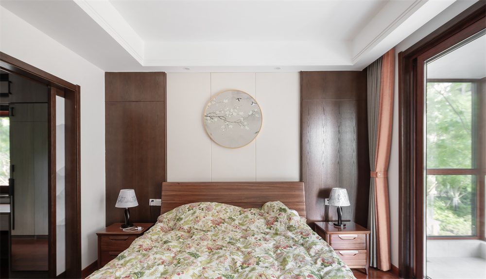 主臥處背景與床單的花紋配色透露出一股春天的和煦美好。背景墻上的重視掛畫,蜿蜒生長的枝條,成群飛翔的燕子展現(xiàn)出自然的生機(jī)。右側(cè)帶了一個(gè)陽臺,外面枝葉茂盛,樹葉搖動(dòng),臥室被綠意包圍。