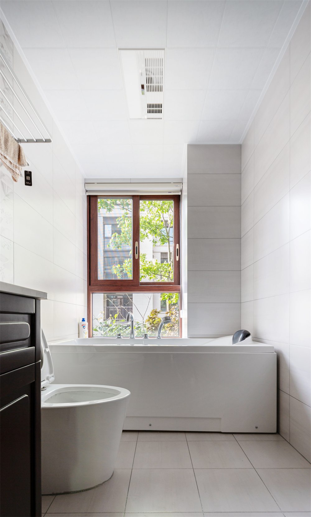 浴室中依舊是中雅胡桃色的窗戶邊框。白色給人的感覺非常干凈利落,在窗戶頂做了抽拉式百葉窗的設(shè)計(jì),便于在洗漱時(shí)窗簾的拉起和放下,手動(dòng)的也更能增加體驗(yàn)的感覺。