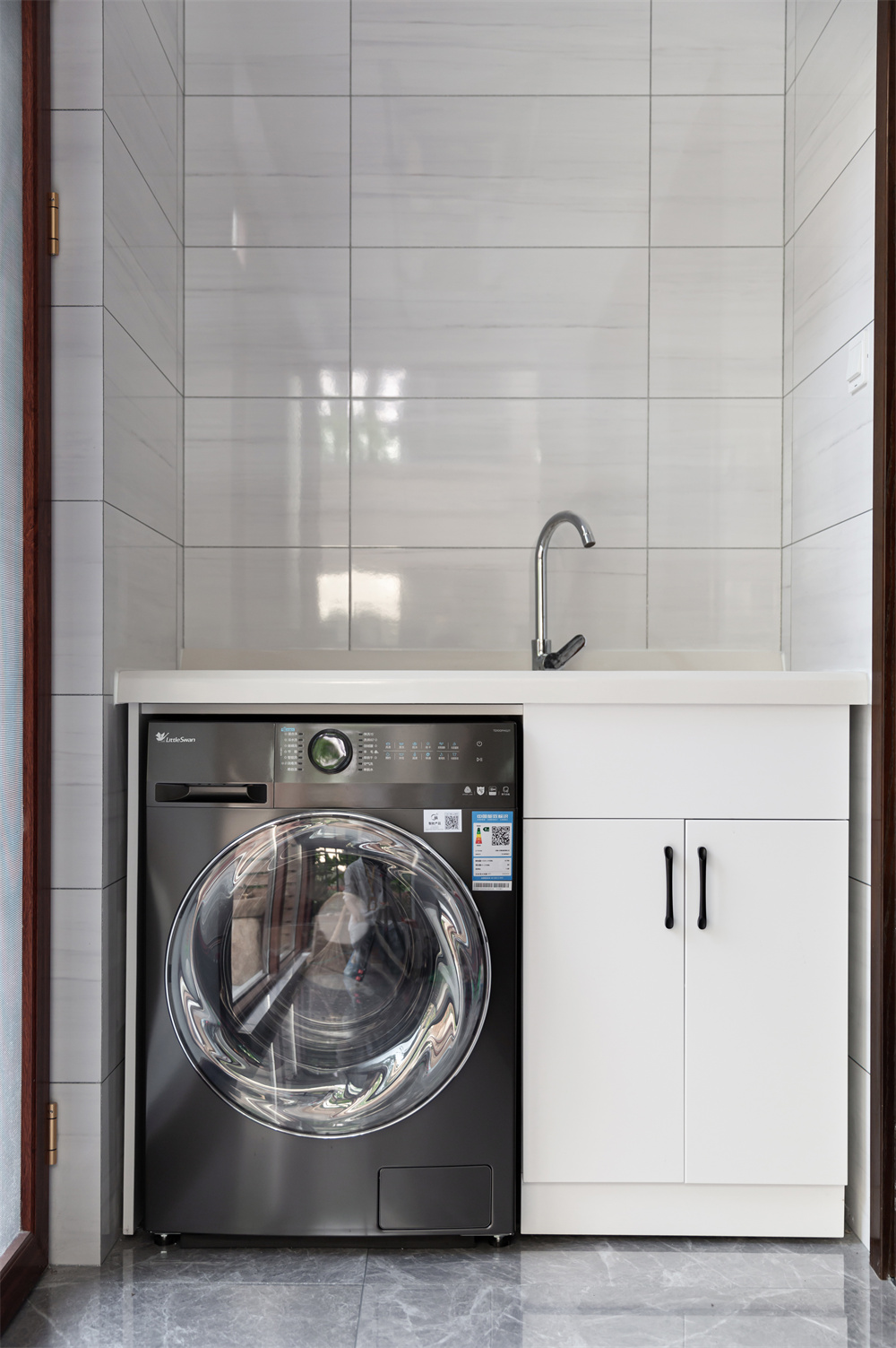 主要的陽臺位于一樓,從陽臺就可拉開門進(jìn)入自帶的小院。陽臺處裝修的十分簡單,極簡的白色洗衣機(jī)柜,地面是與客廳處一脈相連的灰色系地磚,簡簡單單不會(huì)削弱中式風(fēng)格的基調(diào)。大部分戶型都會(huì)在陽臺處做洗衣機(jī)柜,不僅節(jié)省裝修空間,而且美觀大氣。