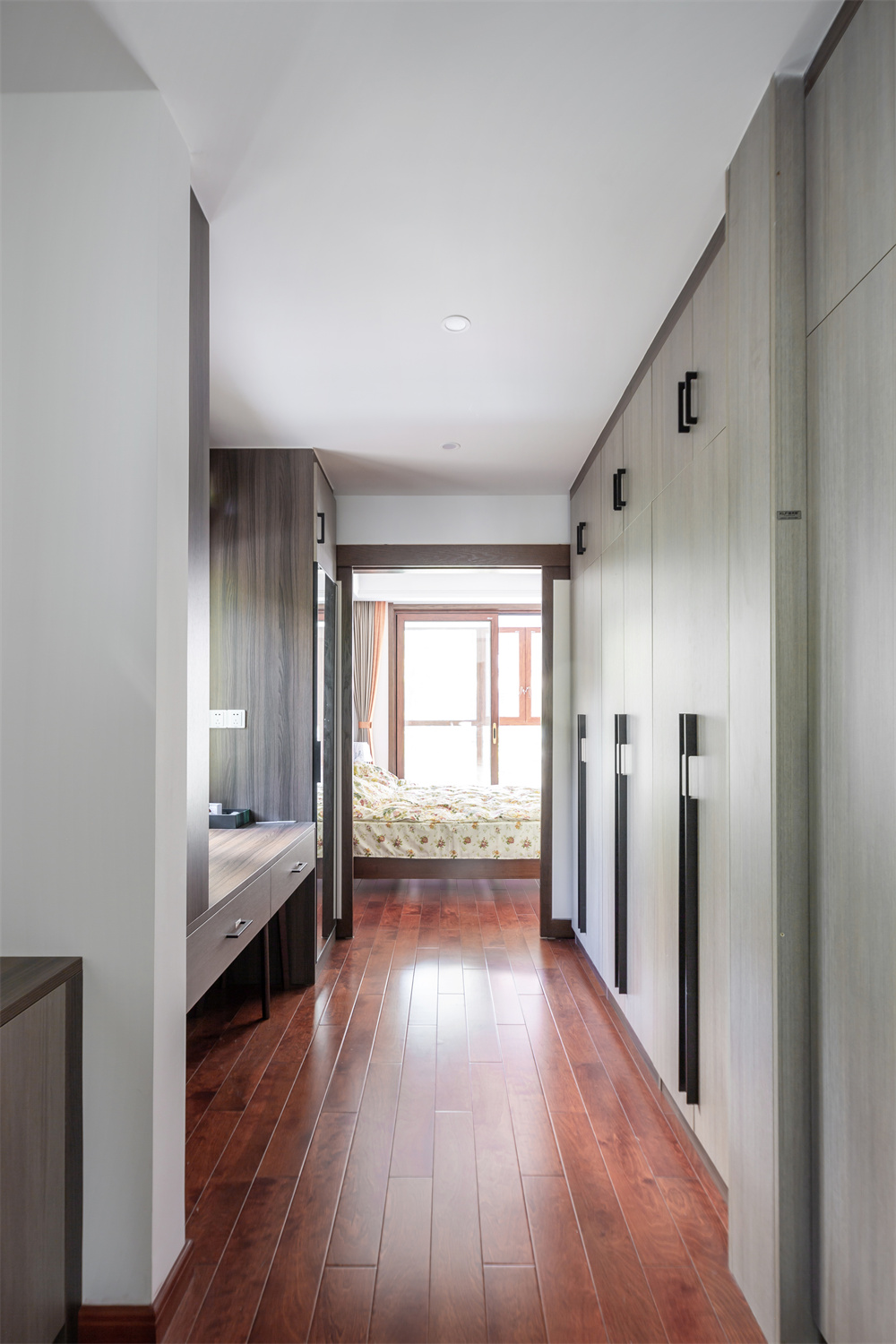 走廊雖然與主臥相連接,但是臥室處中間采用推拉門的設(shè)計(jì),關(guān)上就是兩個(gè)各自獨(dú)立的空間。走廊處整面到頂?shù)囊鹿?,可以?dāng)做整體的衣帽間來使用,收納衣物的能力很強(qiáng)。