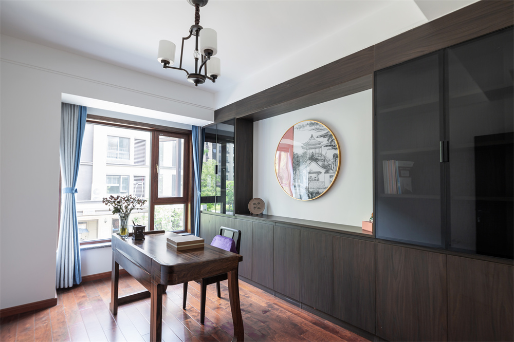 書房是屋主特地為愛人準(zhǔn)備,便于愛人日常辦公的需求,特地選取了一間風(fēng)景優(yōu)美的房間作為工作區(qū)域。仿佛如黃鶴樓般的裝飾畫,處處透露出濃郁的中式風(fēng)。茶色的玻璃柜可以映照出窗外的景色,在這里辦公非常安靜,可以集中精力思考處理事務(wù)。