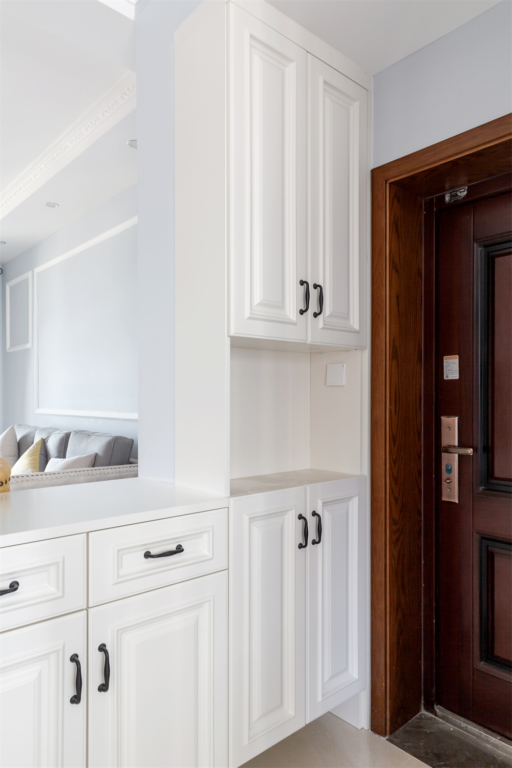 從進(jìn)門處映入眼簾的是整體芬蘭白的玄關(guān)柜,屋主選擇做了L型的玄關(guān)柜。延伸出類似于吧臺(tái)的設(shè)計(jì),在視覺上與客廳處相連接,同時(shí)放大玄關(guān)處的空間感。