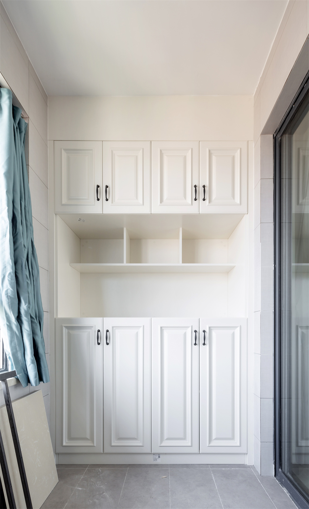 朝南的陽臺(tái)可以在太陽升起時(shí),感受來自清晨的第一縷陽光,芬蘭白整面到頂陽臺(tái)柜的設(shè)計(jì),可以放置衣架以及冬天的鞋子。中間鏤空部分加做了三個(gè)空格,給收納增加了額外的空間。