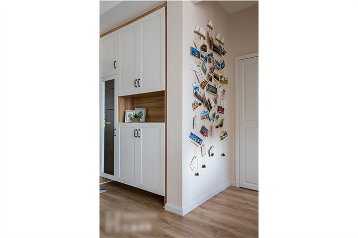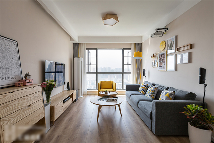 進入客廳,首先映入眼簾是簡約的白色立柜和一組照片墻的設(shè)計。每一張照片仿佛都在述說一個故事,記錄這個95后小夫妻每個難忘的瞬間??蛠砀6ㄖ频姆姨m白入戶柜和木門在照片墻的陪襯下溫馨感十足。撞色的沙發(fā),簡潔明快的亮黃色搭配深灰色立體感拉滿,駝色墻面上的藝術(shù)畫交錯搭配,透露著一絲文藝氣息。
