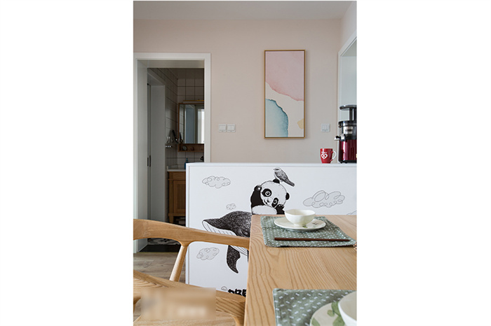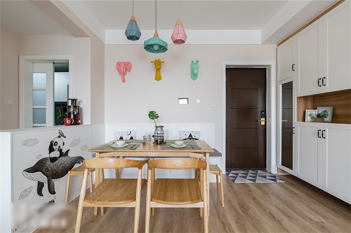 餐廳除了滿足正常用餐的需求之外,還增加了收納功能。為此客來福在餐廳處專門定制了一排繞墻的沙發(fā)柜,這樣家里就算多幾個人來就餐,也不會顯得擁擠。原木色的餐桌與馬卡龍色系的吊燈平衡出北歐精致。餐廳墻面上,三種動物的掛件與同色系吊燈在鮮明的顏色中演繹著北歐風(fēng)情。