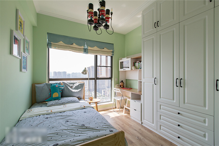 兒童房以綠色為背景,搭配白色吊燈和立柜,活潑中還有一絲可愛。墻上的兒童簡筆畫、兒童家具、卡通玩偶,營造了一個夢幻、童真、舒適、富有想象力的空間。