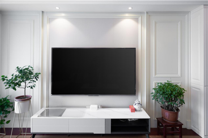 電視背景墻以電視柜為中軸線,兩側(cè)打造對稱的石膏線門板的設(shè)計,將背景墻連成完整的一面,與右側(cè)的餐邊柜花紋樣式相一致,在視覺上形成連貫的效果。電視柜采用的是成品家居,黑白灰三色的搭配簡約卻不失格調(diào)。頂部射燈的光線向下投放,如傘狀。