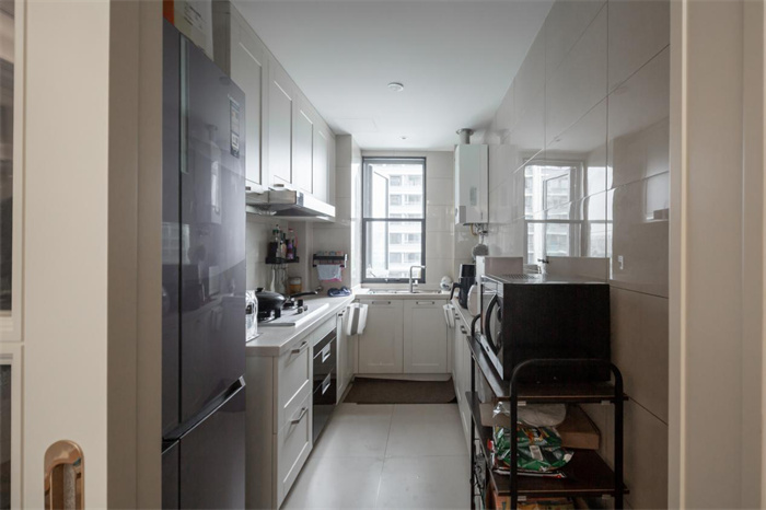 左側(cè)便是與玄關(guān)柜相連的餐邊柜,餐邊柜集酒柜、收納柜的功能于一體,最大限度發(fā)揮出產(chǎn)品的使用價值。芬蘭白的門板顏色與透亮的玻璃相搭配,不需要額外給物品增加神秘感,想要的東西拉開柜門便可以拿到。餐邊柜中間部分上方的圍欄設(shè)計,放置石膏雕像增加空間內(nèi)的藝術(shù)感。廚房:廚房處一眼望去整體空間內(nèi)物品、柜體很齊全,但是顯得略微有些擁擠,容納一到兩個人在廚房里忙活已是足夠 。