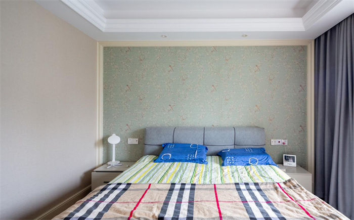 廚房整體是U型的結(jié)構(gòu)布局,左側(cè)為做飯的地方,上方打造了到頂?shù)臋还?,下方安置了消毒柜。櫥柜上方安置了把手,運(yùn)用的阻尼軌道抽拉的設(shè)計,拉開之后再合上就不要太過于用力,順著軌道慢慢就可以完全的閉合。右側(cè)為放置熱水壺、飲水機(jī)的平臺,中間為洗菜的位置,整體功能相對而言很齊全。但是要注意東西擺放的位置,不常用的物品放在較高的櫥柜里面,常用的放在收納架上,可以減少日常拿物品的煩惱。臥室:基于主臥內(nèi)的位置和戶主平時的喜好需求,背景墻采用的是薄荷綠碎花系的背景,透露出如春天般清爽 的氣息,相同色系的薄荷綠和棕色,隨著光線變化展現(xiàn)出不同的柔和質(zhì)感。由于床占據(jù)了臥室內(nèi)相當(dāng)大的部分,所以在臥室門處打造了一個內(nèi)置衣帽間,層層的收納架擺放將衣物和雜物有序的擺放,與衣帽間相反方向?yàn)樾l(wèi)浴間,滿足了日常生活的需求。