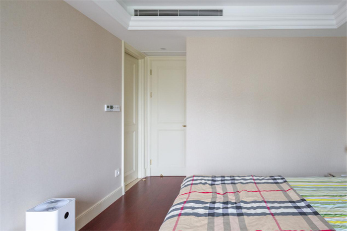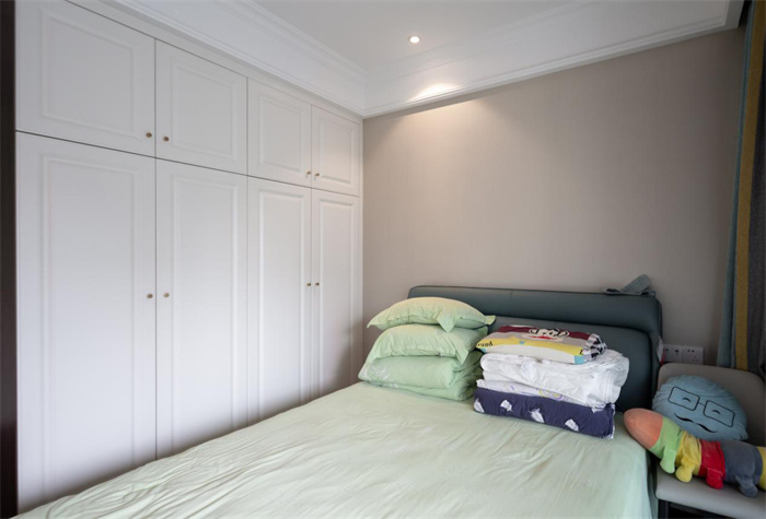 次臥與陽臺相連接,使得整體的光線更加透亮,實(shí)現(xiàn)了在早晨起來便能感受到來自外界的第一縷光亮。與主臥處顏色搭配相反,床鋪使用的是相應(yīng)的淡綠色,背景墻采用的是棕色。一側(cè)整面到頂?shù)囊鹿?,兩開門的衣柜設(shè)計,精美的膜壓門板花紋,給空間增添一絲層次感。金色的立體把手減少了拉開門時的阻力。在打造的時候要注意衣柜與床鋪之間的距離,避免拉開的時候與床邊相碰撞。