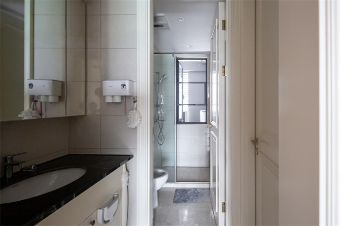 這間是在主臥處的衛(wèi)浴間,半包圍的淋浴間下方做了抬高的踢腳線,更容易散發(fā)衛(wèi)浴間的水汽。戶主想要將衛(wèi)浴柜、淋浴間有序的安排在同一空間內(nèi),所以設(shè)計師在高度、尺寸和位置方面進(jìn)行多方的測量,才最終決定這三處的位置。