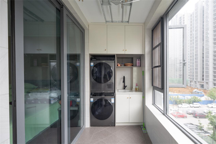 通過陽臺可以看見窗外郁郁蔥蔥的樹木,小區(qū)的居住環(huán)境優(yōu)美,安靜宜人。陽臺呈現(xiàn)狹長的形狀,一側(cè)為洗衣機(jī)柜,根據(jù)兩個洗衣機(jī)的高度比例進(jìn)行打造,上方較高的柜體放置一些洗滌用的雜物,下方放一些衣架便于拿取。洗衣機(jī)柜與餐邊柜為同樣的門板顏色和把手形狀,打造起來比較省心。