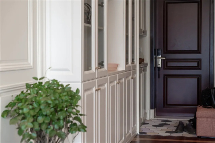 這戶是客戶裝修通風后剛搬進新家不久,家居、收納擺設、廚具都是煥然一新的。玄關柜、餐邊柜包括衣柜都是使用的客來福全屋定制的產(chǎn)品,鉸鏈使用的是客來福自產(chǎn)的鉸鏈,精準的將柜門與柜身鏈接貼合。把手采用統(tǒng)一的金色立體樣式,此外可以根據(jù)自己的愛好選擇其他樣式。