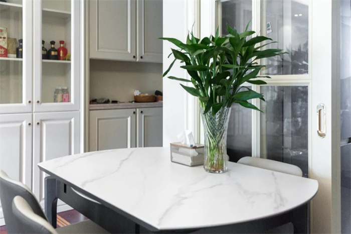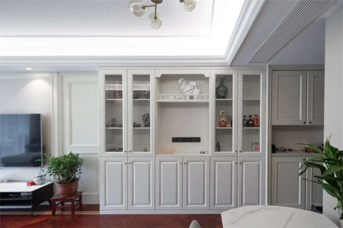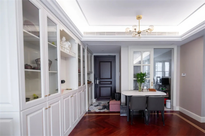 左側(cè)便是與玄關柜相連的餐邊柜,餐邊柜集酒柜、收納柜的功能于一體,最大限度發(fā)揮出產(chǎn)品的使用價值。芬蘭白的門板顏色與透亮的玻璃相搭配,不需要額外給物品增加神秘感,想要的東西拉開柜門便可以拿到。餐邊柜中間部分上方的圍欄設計,放置石膏雕像增加空間內(nèi)的藝術感。