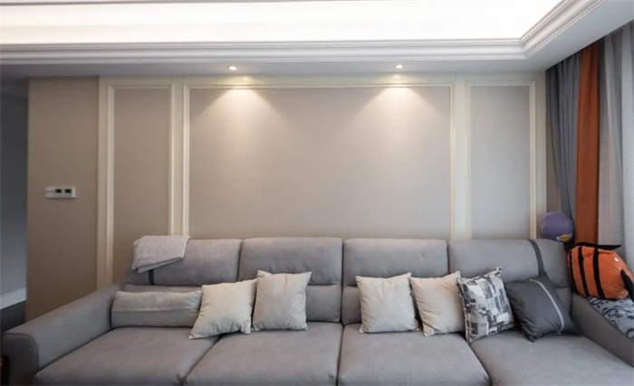 灰色系的沙發(fā),米色系的抱枕,暖黃色的射燈營造溫馨的家庭氛圍,回到家后躺在沙發(fā)即可享受此刻的柔軟。柔和的棕色與米白色的石膏線背景墻打造仿佛融為一體,同樣是對稱的設計與電視背景墻相呼應。如果感覺背景墻有些單調(diào),可以掛上長方形的掛畫來增加空間內(nèi)的豐富性和層次感。