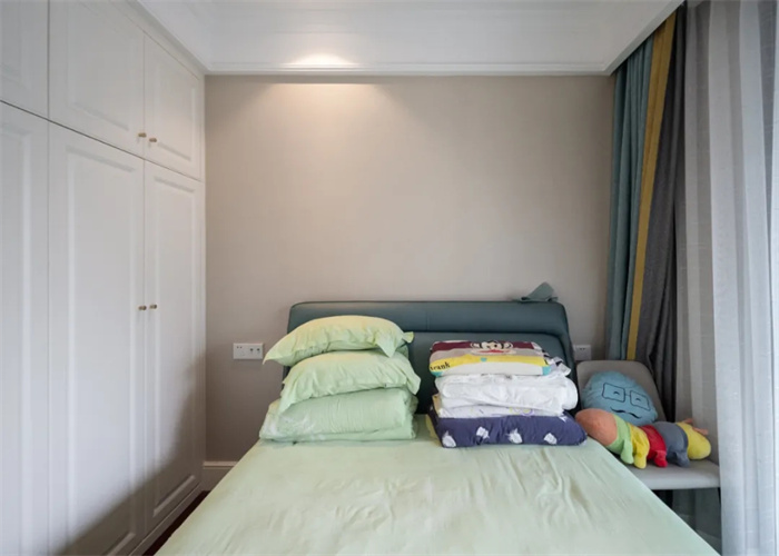 次臥與陽臺相連接,使得整體的光線更加透亮,實現(xiàn)了在早晨起來便能感受到來自外界的第一縷光亮。與主臥處顏色搭配相反,床鋪使用的是相應的淡綠色,背景墻采用的是棕色。