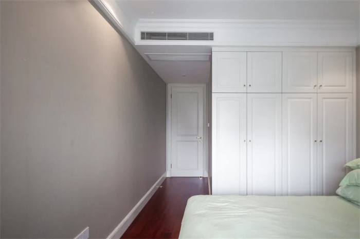 一側(cè)整面到頂?shù)囊鹿瘢瑑砷_門的衣柜設計,精美的膜壓門板花紋,給空間增添一絲層次感。金色的立體把手減少了拉開門時的阻力。在打造的時候要注意衣柜與床鋪之間的距離,避免拉開的時候與床邊相碰撞。