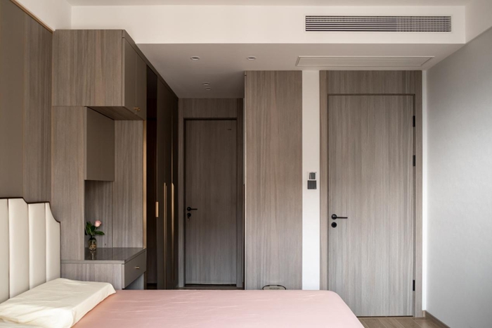 主臥中帶有一個衛(wèi)生間是大部分戶型常有的配置,也是給主臥的隱私性更上一個檔次。主臥的床頭宛如徽派建筑中的馬頭墻,頗具有造型感和美感。床頭背景和梳妝臺的柜體顏色和板材保持一致,使家中的元素保持統(tǒng)一不紊亂??拷T處為兩開門的整面衣柜,茶色的玻璃外觀搭配金色的長條把手,體現(xiàn)出輕奢的質(zhì)感。整面衣柜中三條豎線給空間增加線條感,也讓拍攝者感覺出戶主是非常有條理和邏輯性的人。