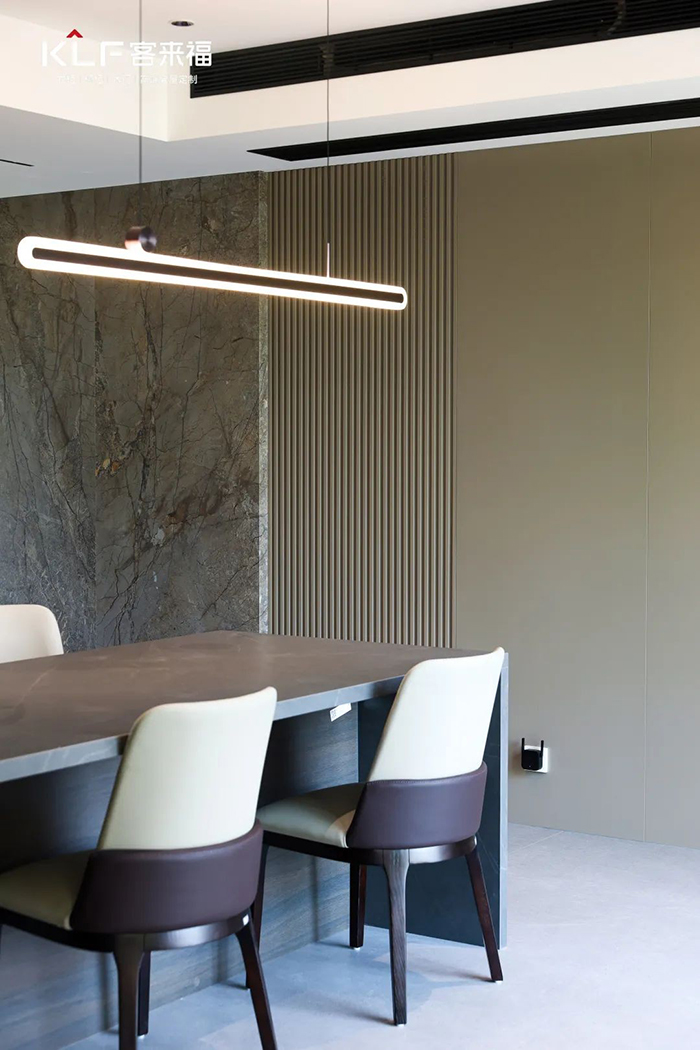 二層作為餐廚空間,圍繞簡(jiǎn)約設(shè)計(jì)理念在家居配色上以黑灰等深色系家居設(shè)計(jì)渲染整體氛圍,在墻面設(shè)計(jì)上,設(shè)計(jì)師將大理石與木質(zhì)墻板進(jìn)行結(jié)合,多重材質(zhì)組合,豐富空間元素。