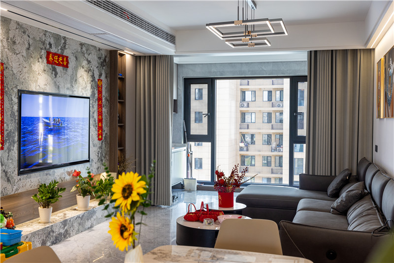 客廳整個(gè)打通后進(jìn)行地磚通鋪,延伸了空間視覺感,在客廳的空間設(shè)計(jì)上以簡(jiǎn)繁結(jié)合的方式,在電視柜背景墻上,以大理石石材進(jìn)行裝飾,為全屋帶去更多的冷感。