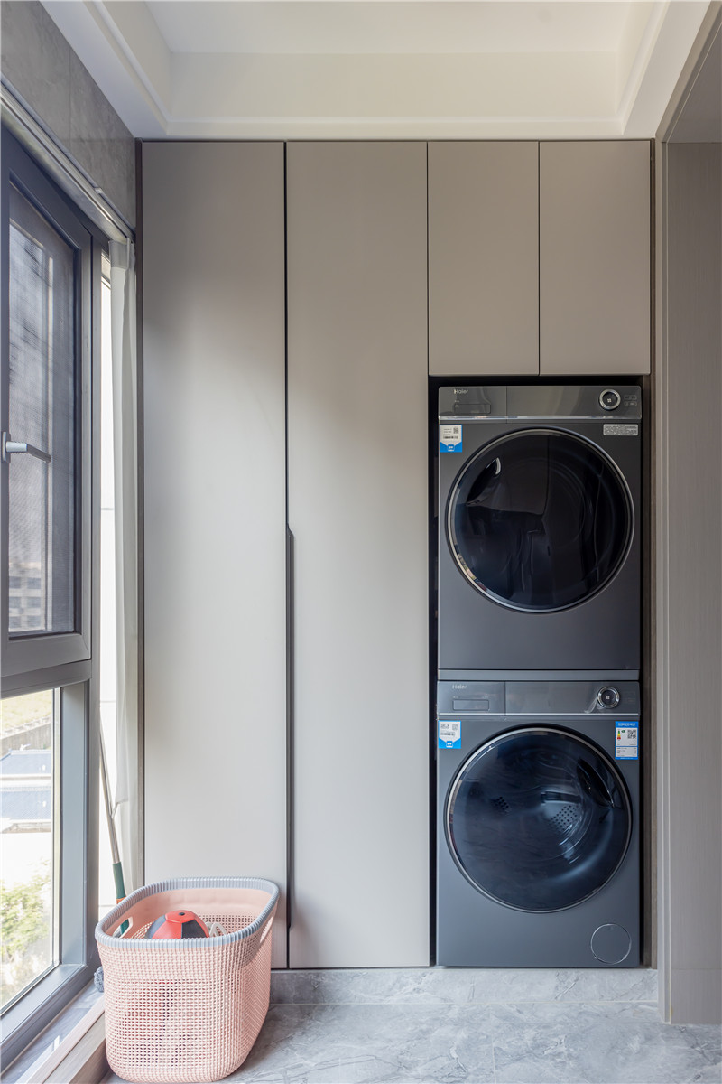 在這戶案例中,收納需求和居住的舒適性是屋主所追求的。所以在陽臺(tái)空間上,屋主與設(shè)計(jì)師也通過兩組柜子讓家變得更干凈。一側(cè)做家政柜嵌入洗烘家電,到頂高柜內(nèi)部分區(qū)合理,很實(shí)用。