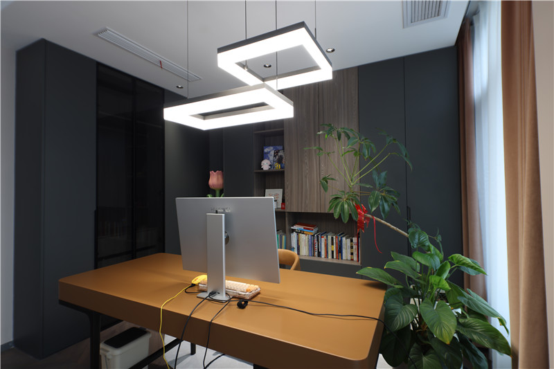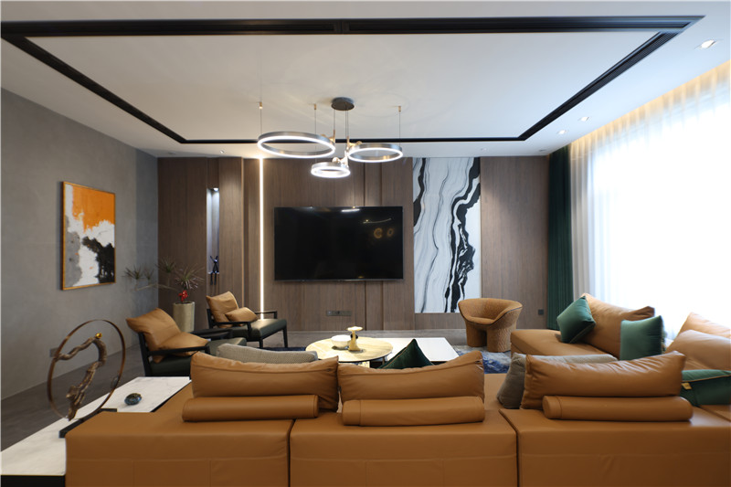 整面木質電視背景墻,引入金屬線條、裝飾構造,多種層次造就別樣魅力;藝術主燈+射燈+條帶燈,氛圍感不言而喻;L型沙發(fā)配合圓弧茶幾與方形底座,便捷舒適。