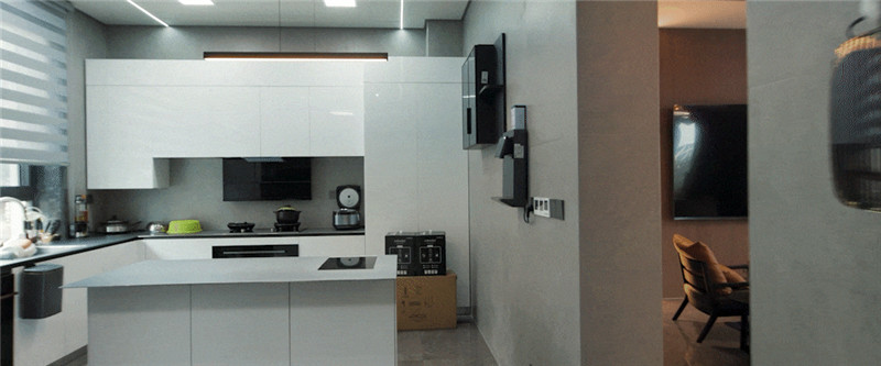 廚房采用中性色,整體簡約大方;將烤箱等大電器嵌入柜體中,視覺明朗;櫥柜+島臺式設計,優(yōu)化整體空間動線。