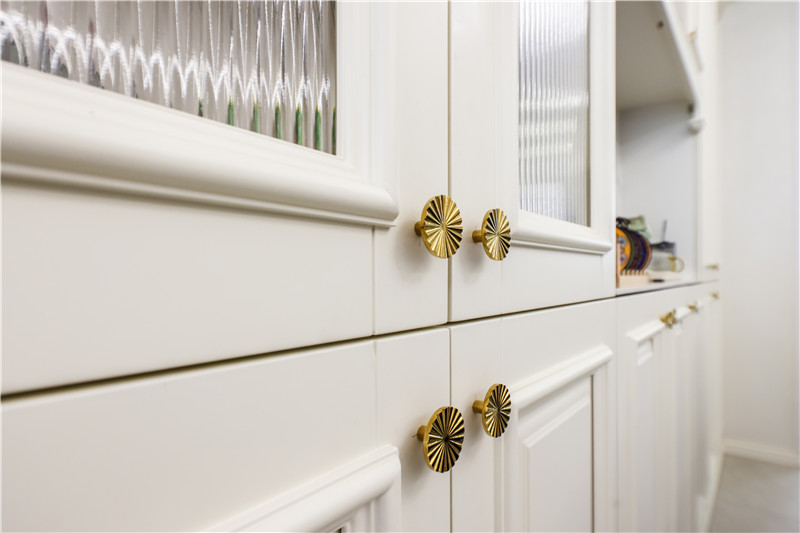 本案例中,柜類采用水漆工藝,0醛添加 0苯添加的環(huán)保屬性下,呈現出產品的高級質感;柜體為芬蘭白色調、柜門為極光色,給人以溫暖治愈之感;造型板設計+太陽花拉手,古典高貴。