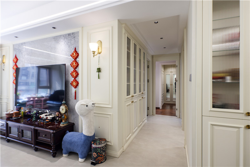 入戶玄關柜為整面到頂構造,協(xié)調整體家居動線、自然美觀;暖色系燈光、凹凸有致的玻璃等元素加入,營造出溫馨氛圍。