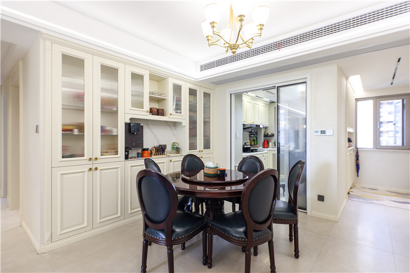 餐廚空間以推拉門做區(qū)隔,減輕油煙困擾;圓弧形配套餐桌,柔和之美下是高安全系數;一字型餐邊柜,中部掏空預留來放水杯、飲水器等,存儲能力強。