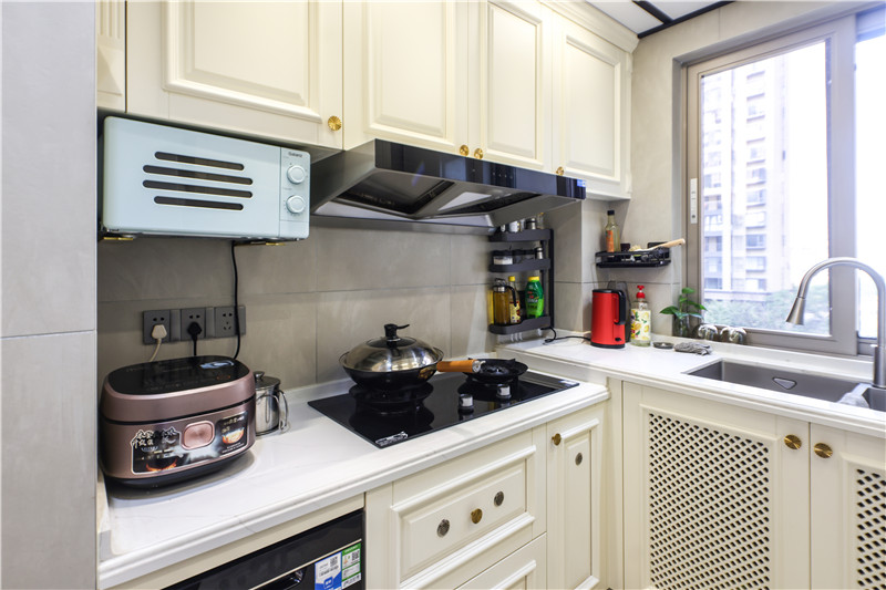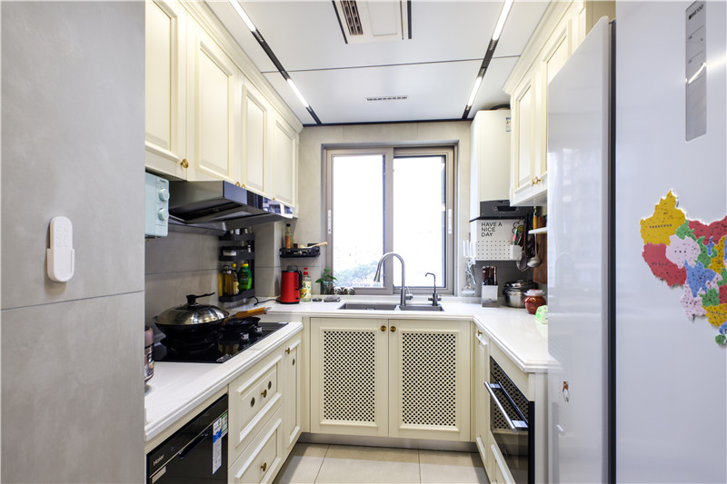 櫥柜整體U型構造,遵循洗→切→烹→盛的動線,使得空間小而不局促;櫥柜加入鏤空設計,空氣流通;將烤箱等大電器嵌入櫥柜中,視覺統(tǒng)一清新。
