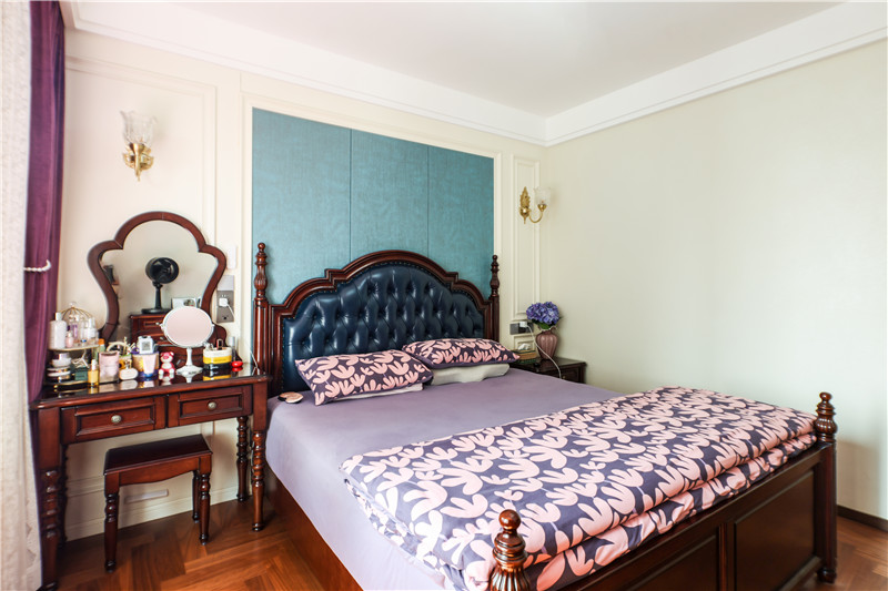 主臥:復古美式的雅致,是主臥空間傳達給人的韻味。床頭背景墻采用藍調,形成拼色;床頭兩側古典樣式小吊燈,時尚奢華;一側床頭柜升級為梳妝臺,高級精致。