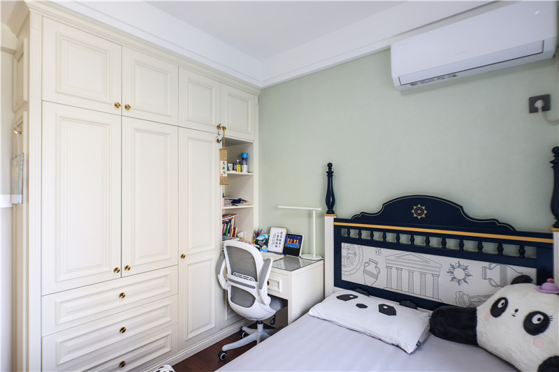 兒童房:床頭板樣式,讓人眼前一亮;衣柜延伸做書桌,協(xié)調自然;柜體設置為長衣、短衣及疊衣區(qū),明晰實用;整體兒童房色彩較豐富,守護孩子的童真童趣。