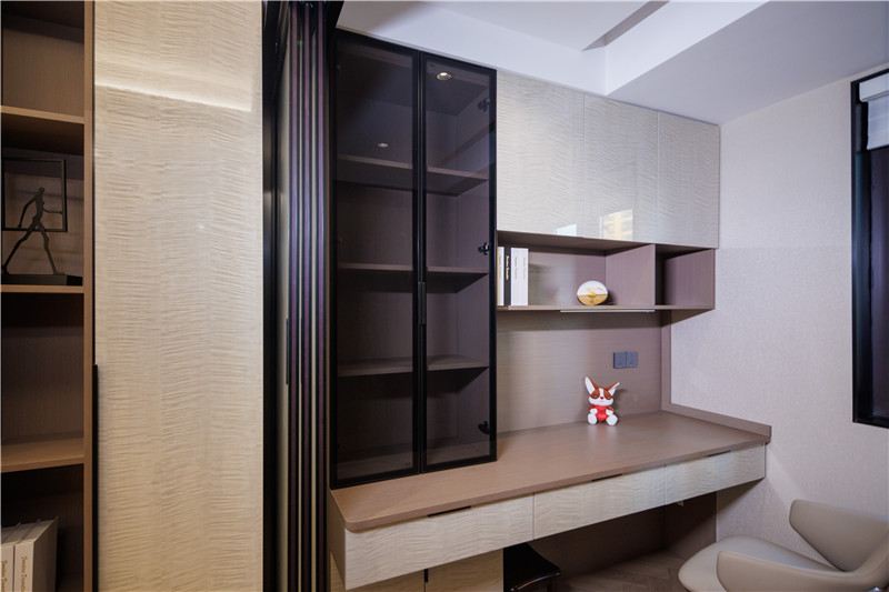 書柜、玻璃柜、抽屜拉手同色,客來福黑好搭且有性價(jià)比;書桌定制高度、燈光巧妙搭配,讓學(xué)習(xí)者舒適沉浸;小書房整體協(xié)調(diào)組合,空間利用率高。