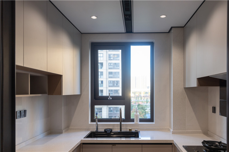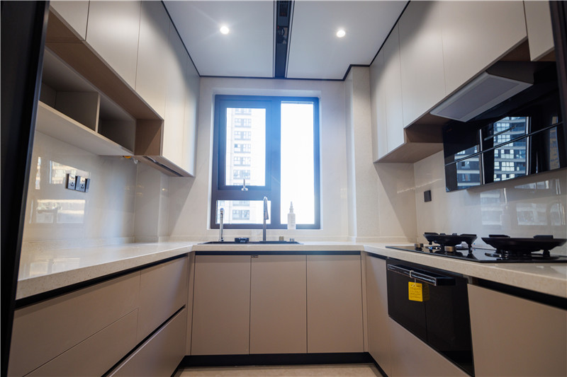 廚房空間遵循洗、切、烹、盛動(dòng)線,減輕隱形家務(wù),其整體巖板臺(tái)面耐刮防滲水,實(shí)用性強(qiáng)。