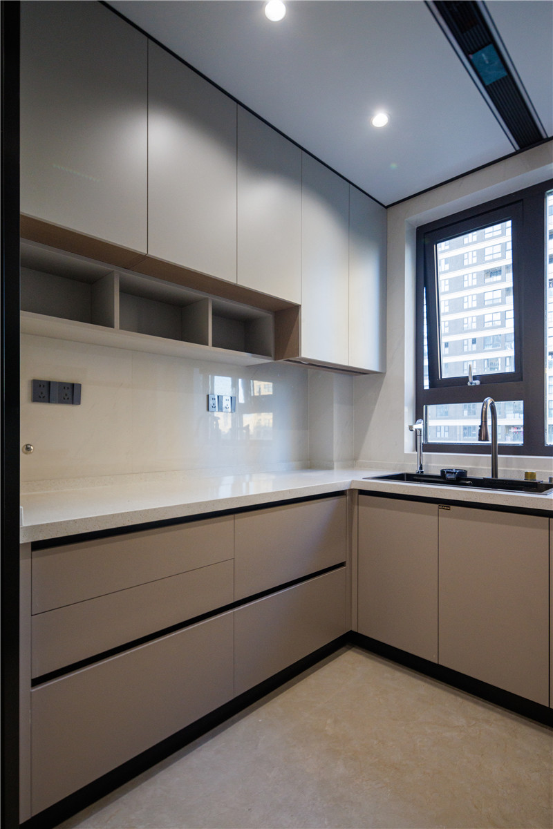 廚房柜體為科技直紋,以膚感帶給居者質(zhì)感體驗(yàn);上柜蘭迪灰搭配下柜米灰,溫潤自然;櫥柜U型依墻而建,將烤箱電器嵌入其中,協(xié)調(diào)多物品收納的難題。