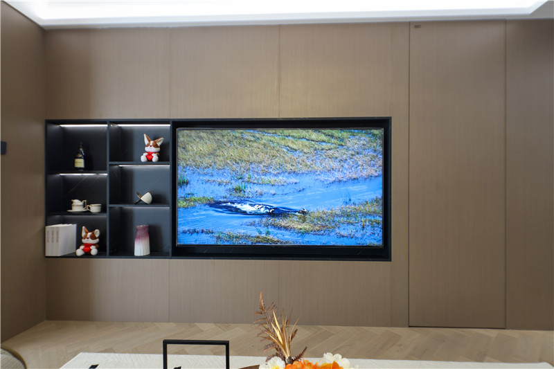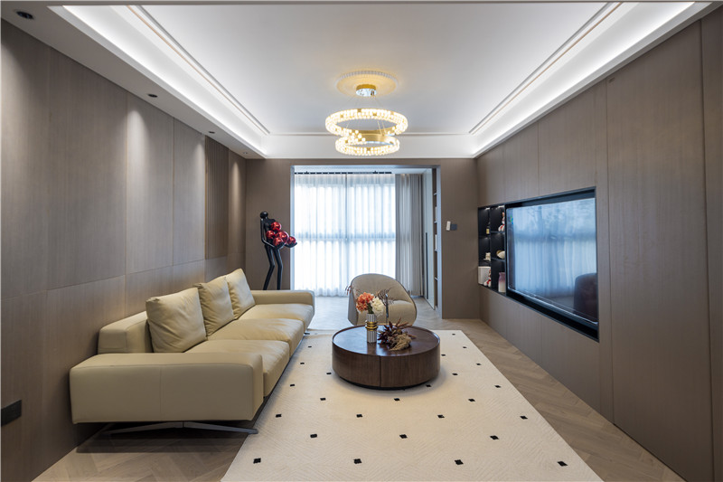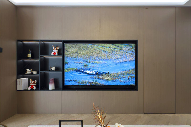 電視背景墻為科技直紋,電視機(jī)、裝飾柜深調(diào)嵌入,以視覺差突出美感;沙發(fā)背景墻科技直紋+水漆科技銀梨+柵格設(shè)計(jì)+射燈,拼接式彰顯智慧;硬裝與軟裝相輔相成,雅致大氣。