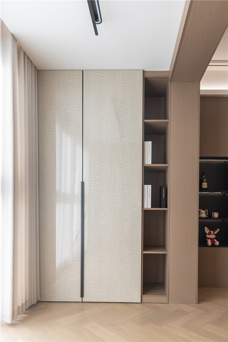 玄關(guān)柜為整面立柜,長拉手、短拉手、無拉手配合,簡約利落、清新雅致。