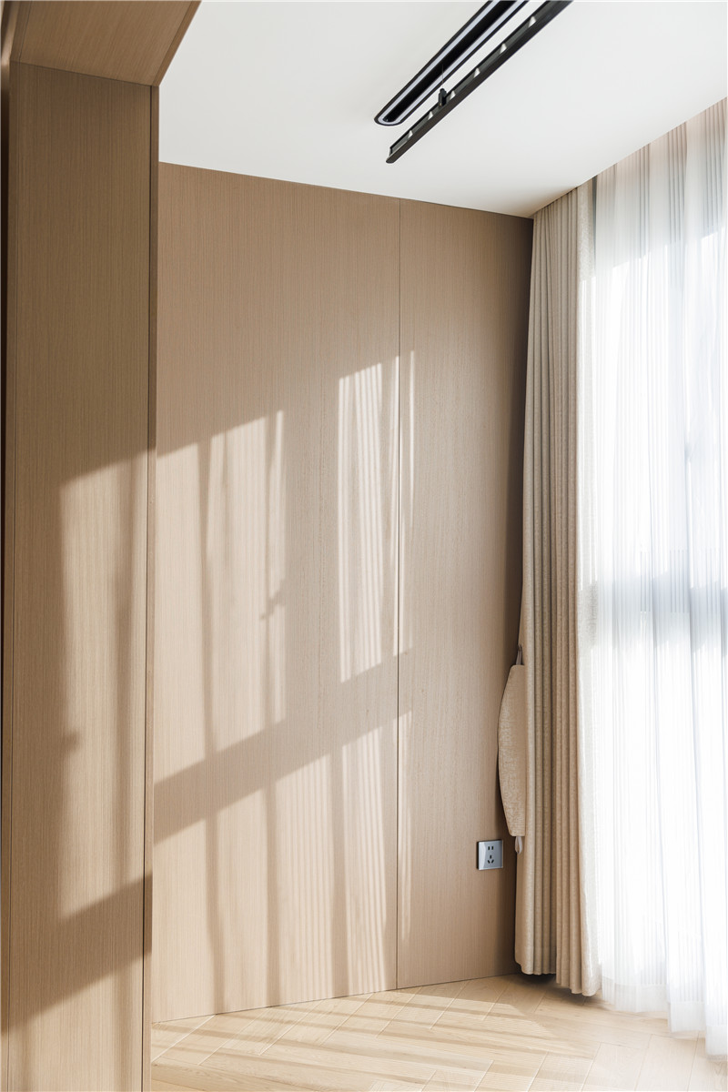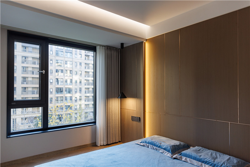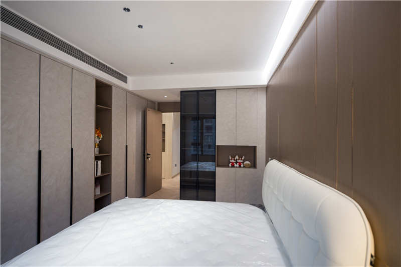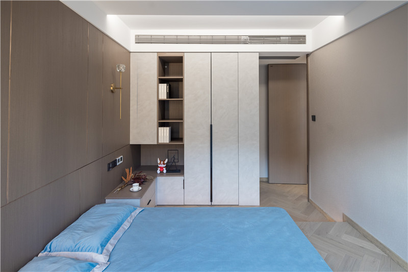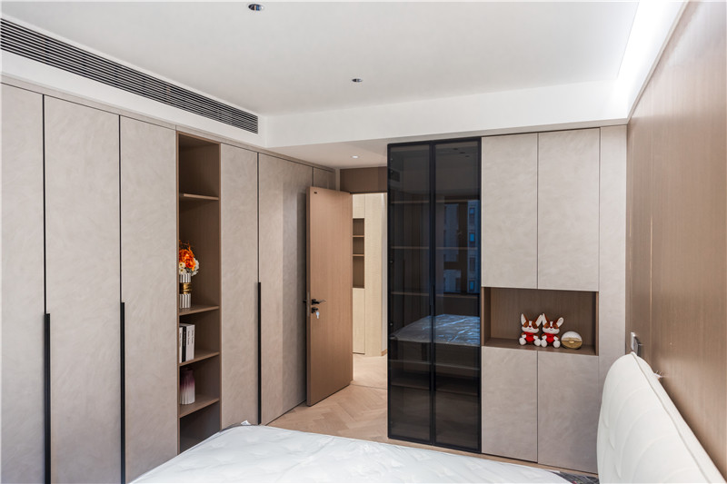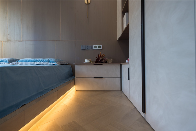 衣柜延伸以主臥的構(gòu)造,差異于延伸床頭柜,柜體科技直紋與水泥灰門板形成跳色,一體化設(shè)計(jì)和諧統(tǒng)一。