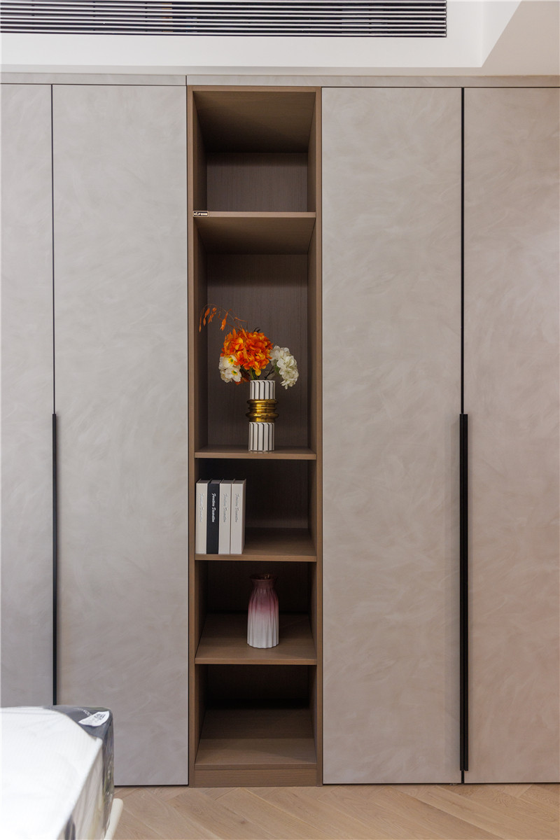 進(jìn)門整面一字型衣柜映入眼簾,水泥灰超雅板顯沉穩(wěn),長柜以掛為主好用便捷,中部組合以隔層,放書、裝飾物都可。