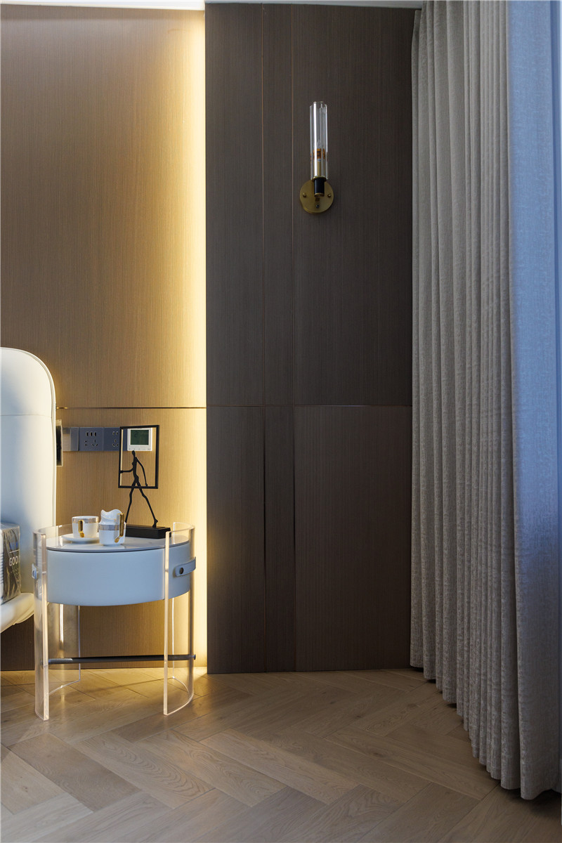 床頭背景墻同系列科技直紋,點(diǎn)綴以縱向金屬色線,時(shí)尚不俗;床頭一側(cè)木柜與玻璃柜組合、中部掏空,增強(qiáng)收納的靈活性;床頭柜柱形構(gòu)造,視野向上配合以縱向條帶燈、壁燈,擁有古典精致感。
